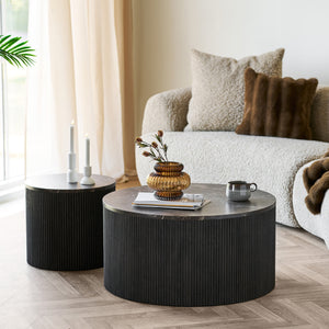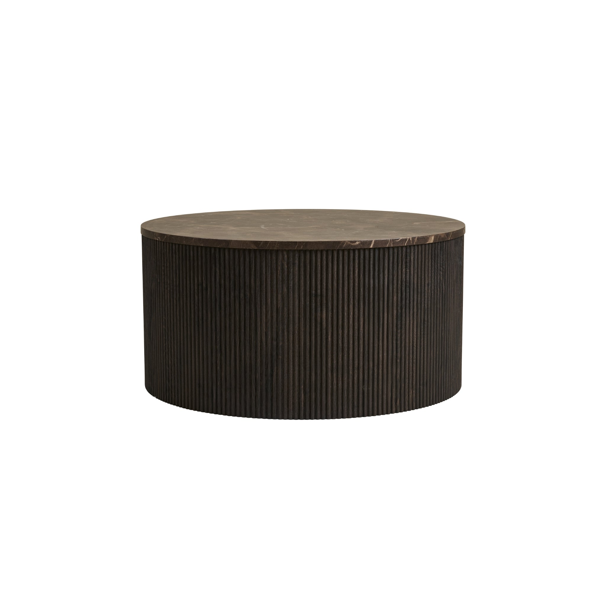 Rota Coffee Table i mörkbrun marmorerad design. Elegant runt soffbord i FSC®-certifierat material – tidlöst, slitstarkt och enkelt att montera.